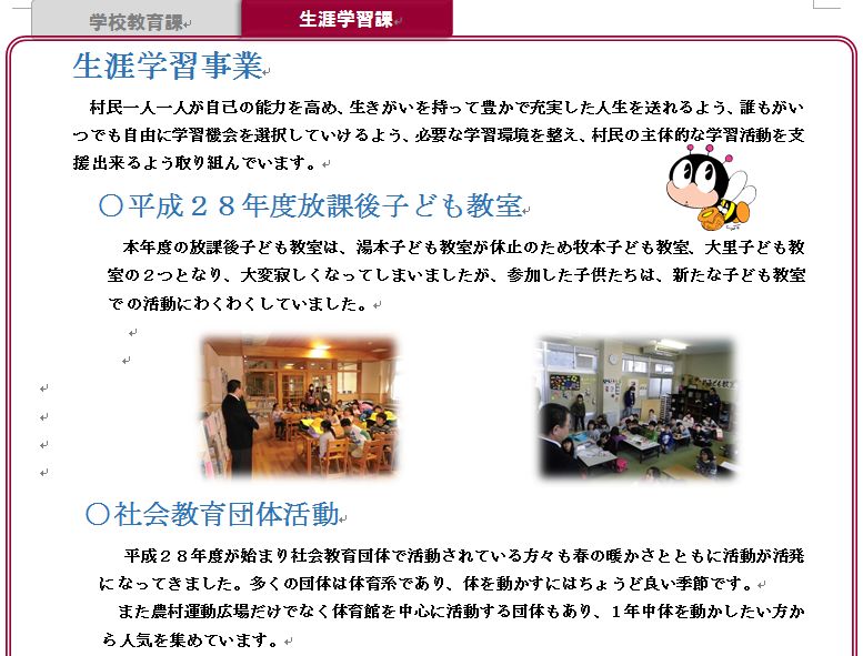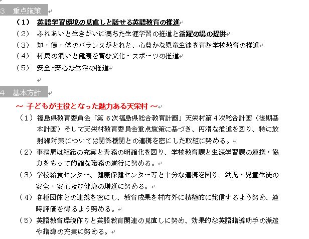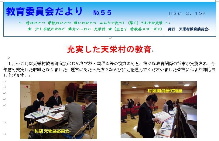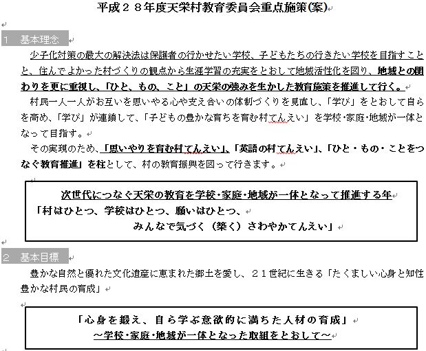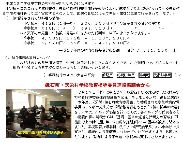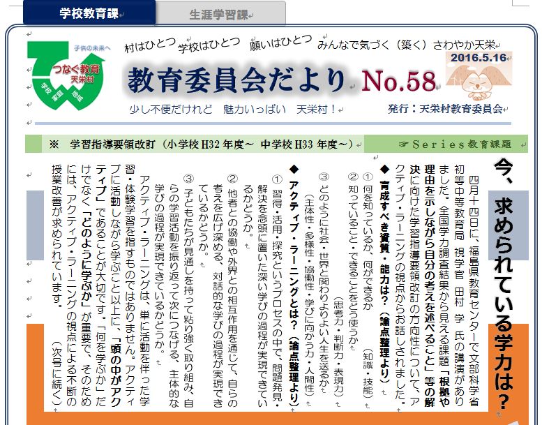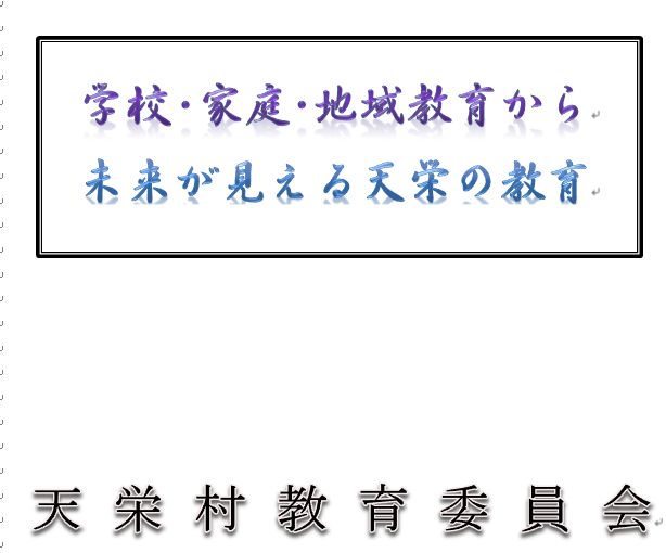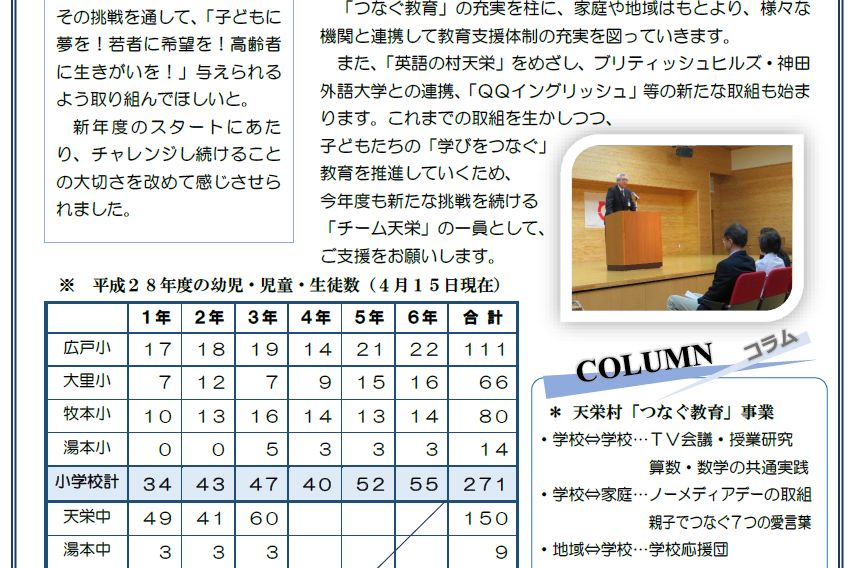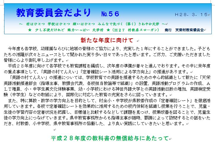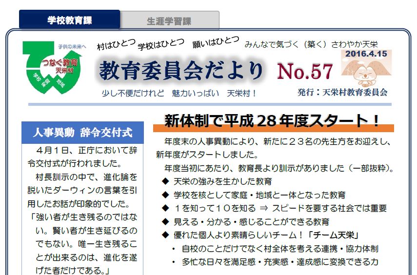 村民の皆様には天栄村教育推進のため、ご理解とご協力をいただいておりますことに深く感謝申し上げます。平成28年度天栄村教育委員会の基本目標及び重点施策が決定しましたのでお知らせいたします。村民の皆様には「6000村民学校応援団」をはじめ、子どもたちの安全・安心な環境環境づくりのため今年度もご支援を賜りますようお願いいたします。