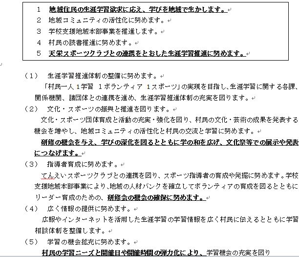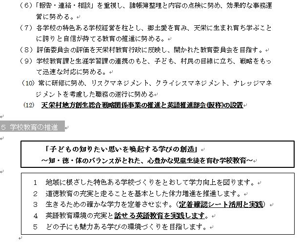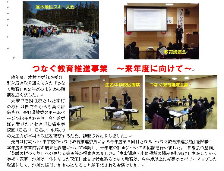 (2) 教育委員会及び村校長会は「つなぐ教育」の基本方針を明確にし、園、学校の実践が円滑に推進するよう、助言及び支援を行う。