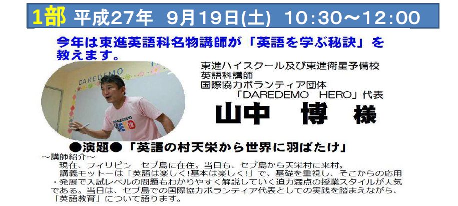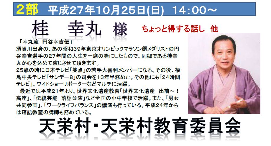 2015年7月16日 15時47分 村制60周年記念事業の一環として、27年度の文化講演会は2部構成で実施いたします。1部は主に中高生対象に東進ハイスクール名物英語講師の山中 博先生から講話をいただきます。2部は桂 幸丸さんの落語でお楽しみいただきたいと思います。