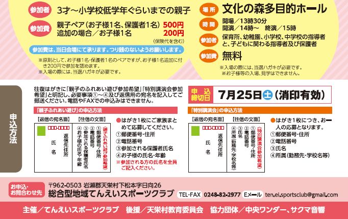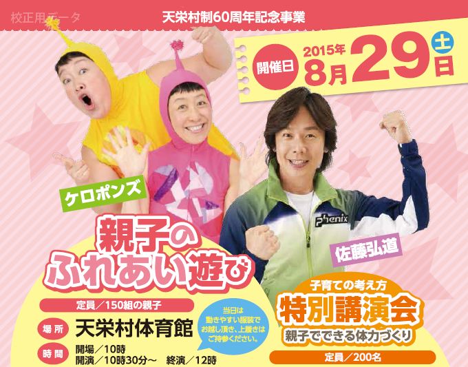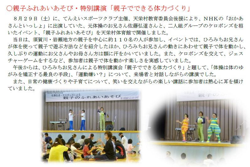体操の弘道お兄さんが天栄村体育館にケロポンズと一緒に来ます。お子さんと一緒にご参加ください。午後には佐藤弘道さんの特別講演もございますので、この機会に参加いただきたいと思います。