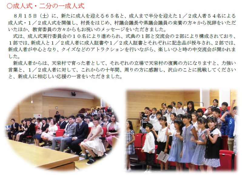 「村は一つ、学校は一つ、願いは一つ 地域コミュニティを核とした天栄だからできる少人数教育」を基本理念として、学校・家庭・地域が一体となって、「つなぐ教育」をとおして子どもたちの夢を実現します。