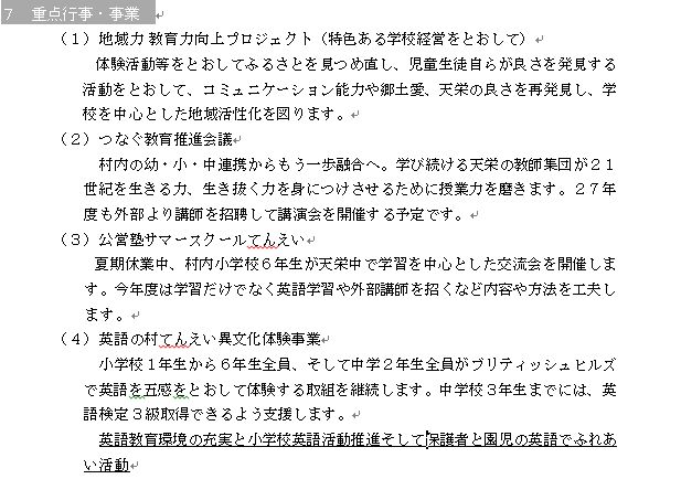 今年度重点施策を中心に、保護者が行かせたい学校、児童生徒が行きたい学校、そして豊かな学びを村民ひとり一人に届けられるよう努力をしてまいります。村民の民様には天栄村教育ポータルサイトをとおして、今年度の取組をお知らせいたしますのでよろしくお願いいたします。