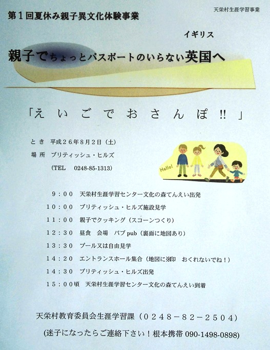 教育委員会では「英語の村てんえい」を目指し、幼稚園、小中学校の英語環境を充実すべく努力をしています。その一貫として生涯学習課では、幼稚園・小学校の親子を対象として「えいごでおさんぽ!」親子で楽しい英語体験を企画しました。 8月2日(土)実施については募集定数に達しましたが、8月9日(土)実施については若干の空きがありますのでお問い合わせください。