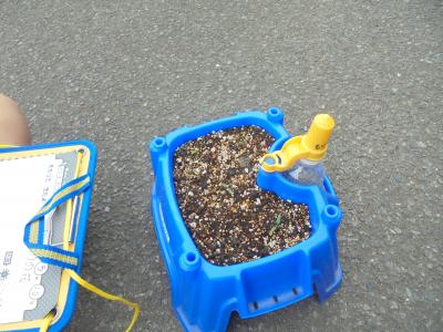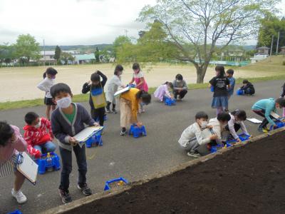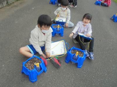 2021年5月27日 09時58分先日タネをまいたミニトマトの芽がでてきたので、全員で芽の観察をしました。ミニトマトの芽はとても小さいですが、顔を近づけたり、触ってみたりして、じっくりと観察しました。「アサガオの芽はハートの形だったけど、ミニトマトは少しとがっている。」「ふわふわしている。」など気がついたことを丁寧に観察カードにまとめました。