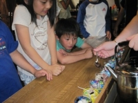 2015年6月3日 16時06分 5年生が2日ブリティッシュヒルズへ行ってキャンドル作りをしました。子どもたちは、一生懸命英語の説明を聞きながら、ガラスのコップに色砂を入れたり、飾りの小物を入れたりしました。最後に透明の燃えるジェルを入れて、きれいなキャンドルを完成させました。