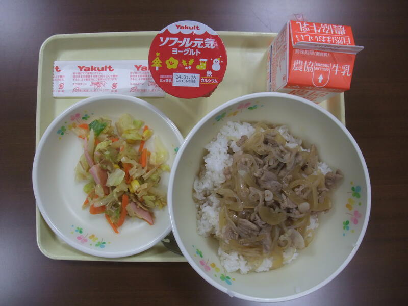 【本日の献立は、揚げごぼう入りいろどりあえ、肉どん、ヨーグルト、牛乳です。】