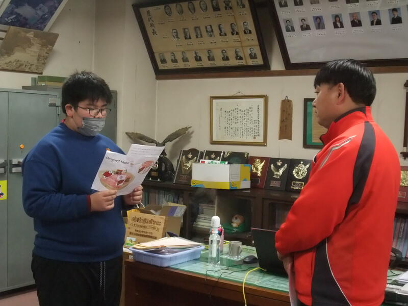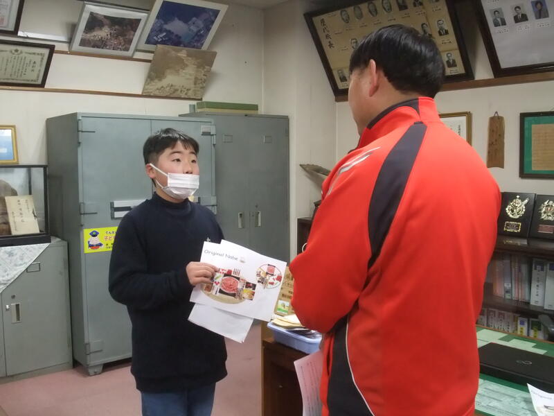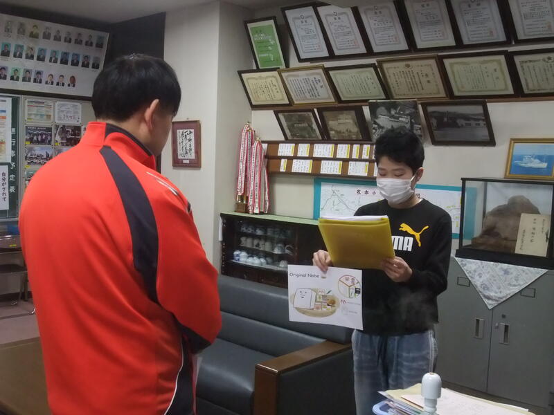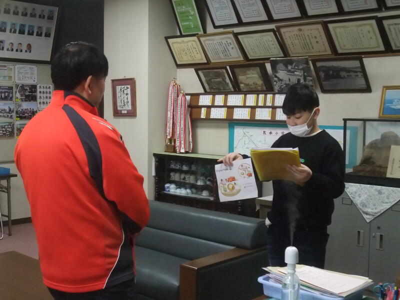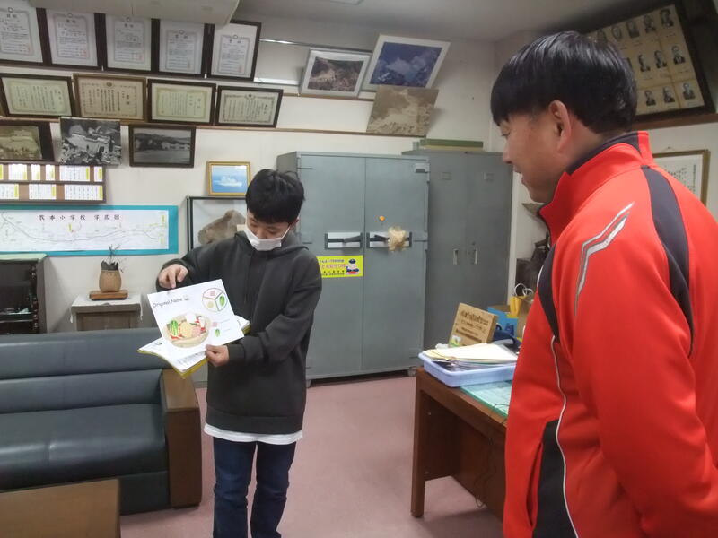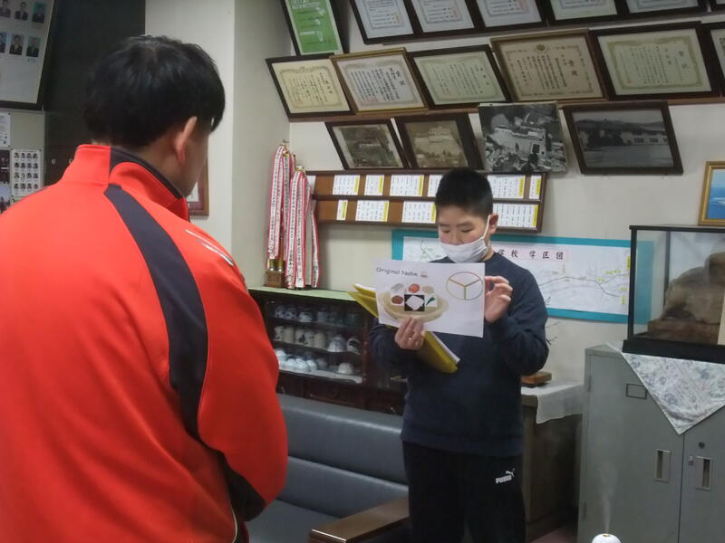 6年生の外国語の授業です。6年生は、自分で考えたオリジナル鍋について、紹介したい先生の所に行って、説明を行いました。校長室にも7名の児童が説明に来てくれました。どれもdeliciousそうでした!