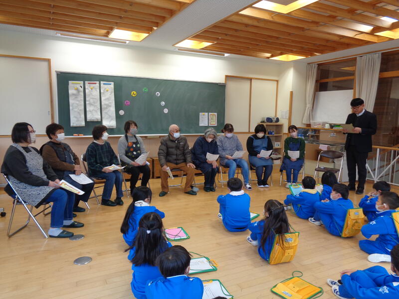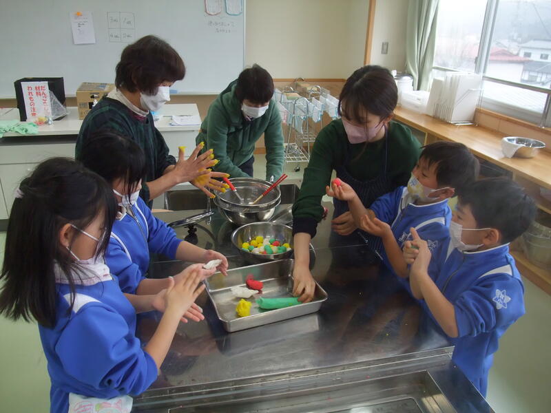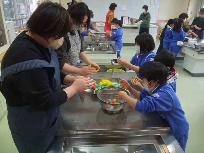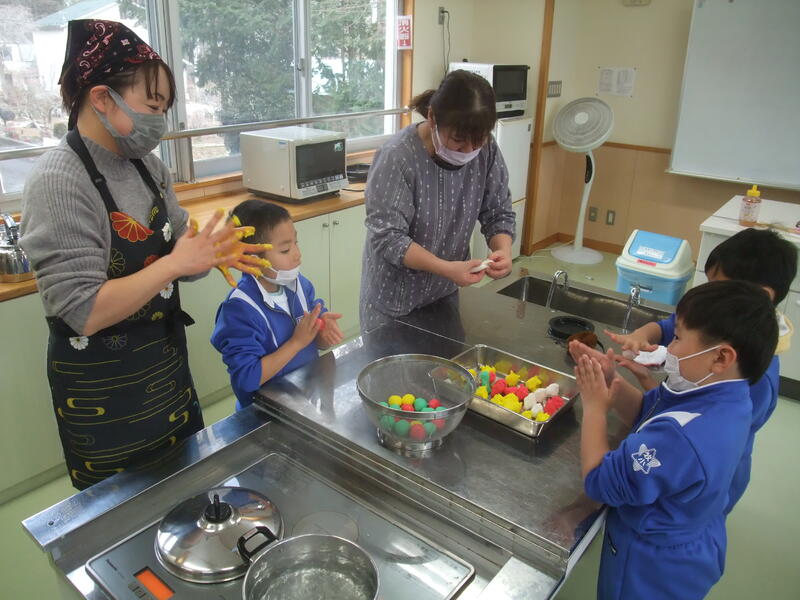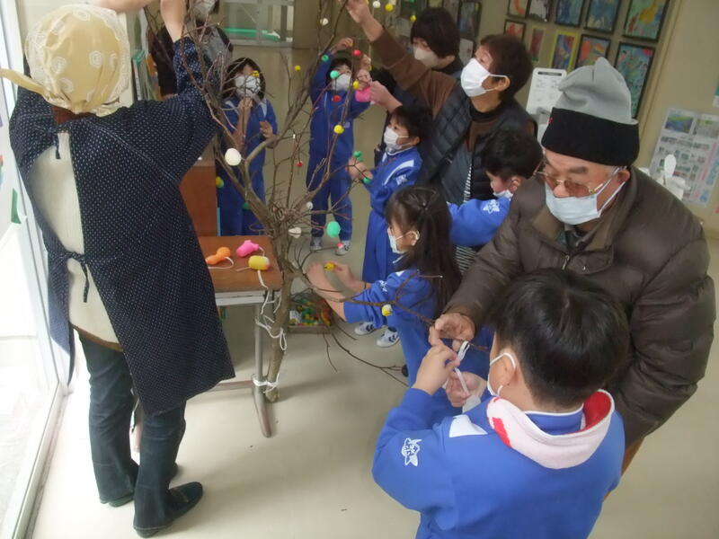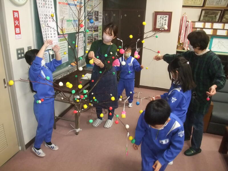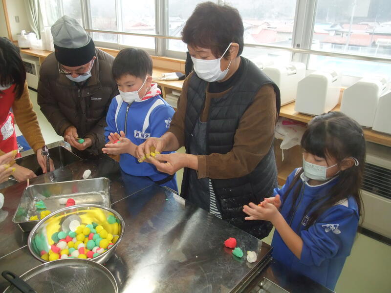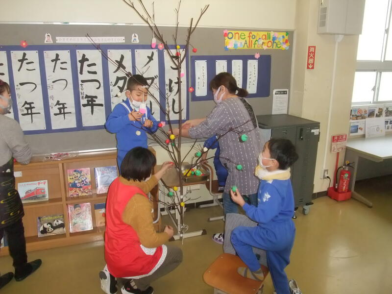 1・2年生は「だんごさし」を行いました。おうちの方々とサツマイモ栽培などでお世話になった松本様がボランティアティーチャーとして来てくださいました。子どもたちは、だんごさしの話を聞いた後、だんごまるめ、飾り付けをボランティアの方々と一緒に行いました。赤、黄、緑、白のカラフルなだんごを松本様からいただいたミズキに飾り付けながら今年一年が良い年であるように願いを込めることができました。