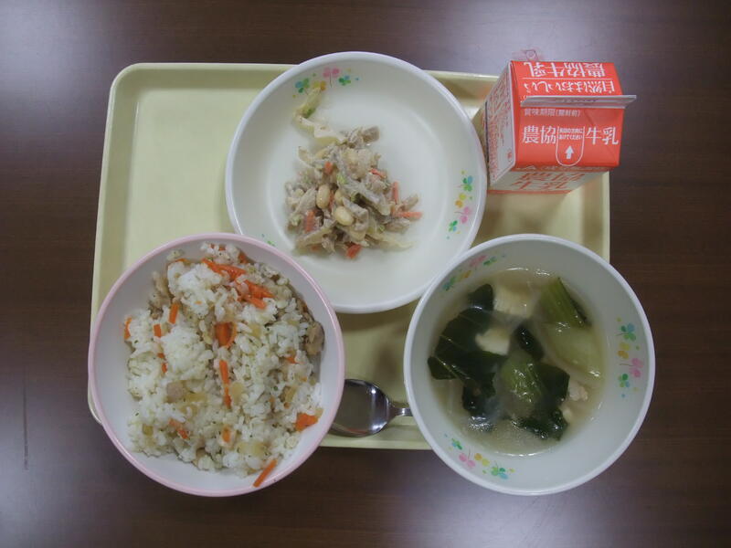 【本日の献立は、ヤーコン入りかみかみサラダ、五目スープ、チキンピラフ、牛乳です。ヤーコンかみかみサラダは、ヤーコンと大豆の食感が楽しいサラダです。】
