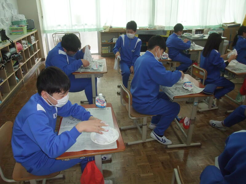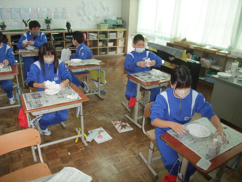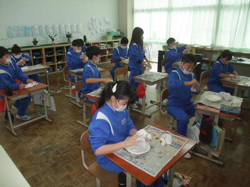 6年生の図画工作科の授業風景です。「固まった形から」という題材で、液体ねんどを含ましたタオルを自分の好きな形にして作品にする授業です。初めての体験に子どもたちも楽しく活動していました。すてきな形の作品ができるといいですね!