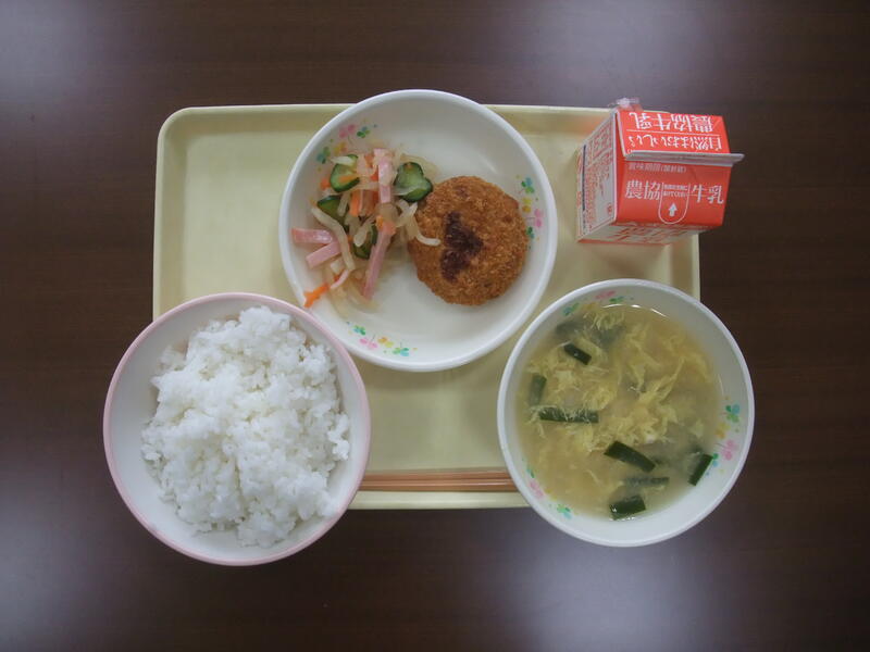 【本日の献立は、メンチカツ、大根サラダ、にらたまみそ汁、ごはん、牛乳です。】