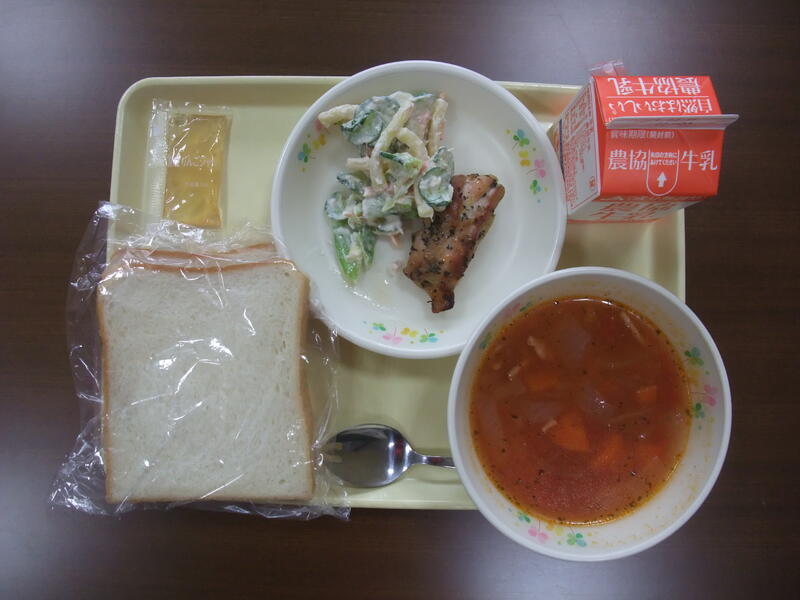 【本日の献立は、とり肉ハーブ焼き、マカロニサラダ、ミネストローネ、県産りんごジャム、食パン、牛乳です。】