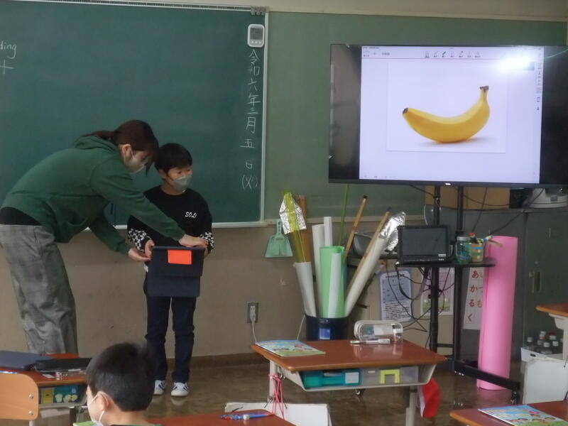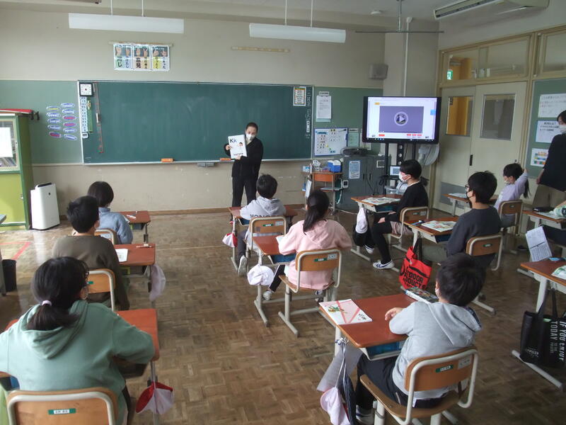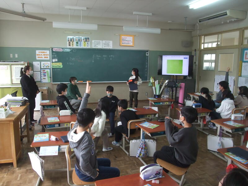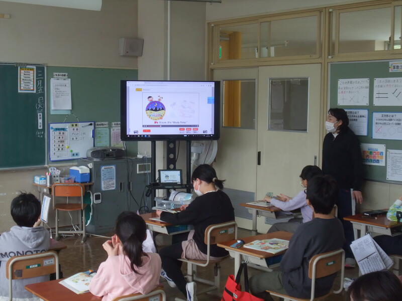 ALTのジャックリン先生にサポートいただいて外国語の授業を行っています。今日は3年生から6年生が行います。