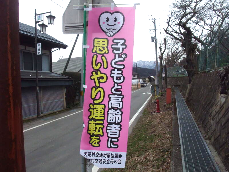 校門前道路にある交通安全ののぼり旗を新しくしていただきました。天栄村交通対策協議会、天栄村交通安全母の会の皆様ありがとうございました。
