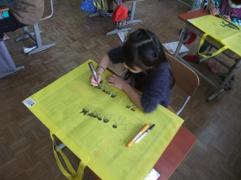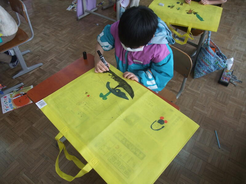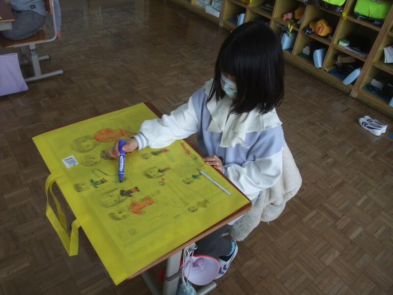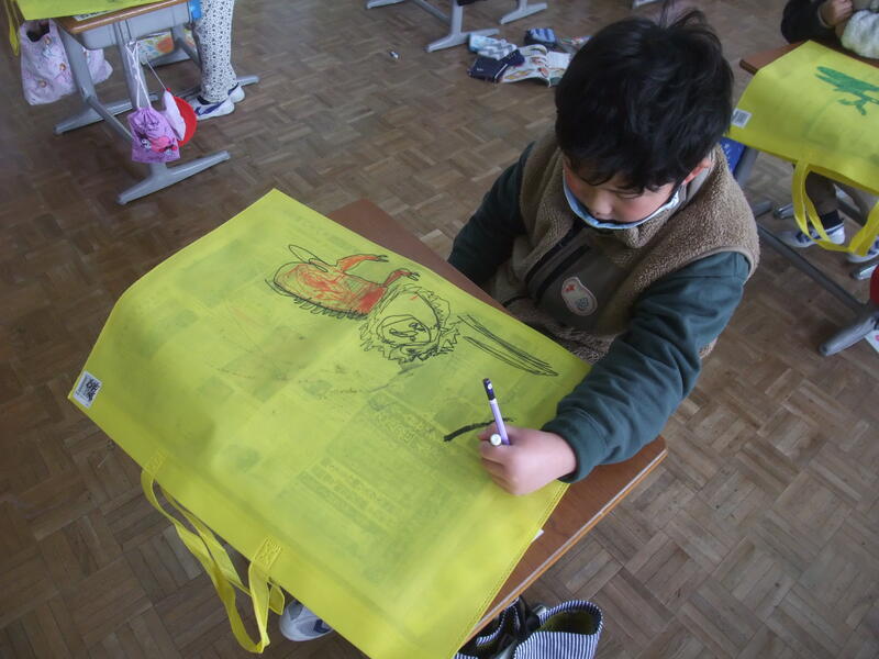 1年生は、絵などの作品を入れる袋に自分が描きたい絵を描きました。人や動物、魚・・・、思い思いに絵を描くことができました。世界に一つだけの作品入れです!
