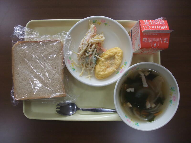 【本日の献立は、「朝食モデル献立②」です。スパゲティサラダ、オムレツ、コンソメスープ、黒糖食パン、牛乳です。】