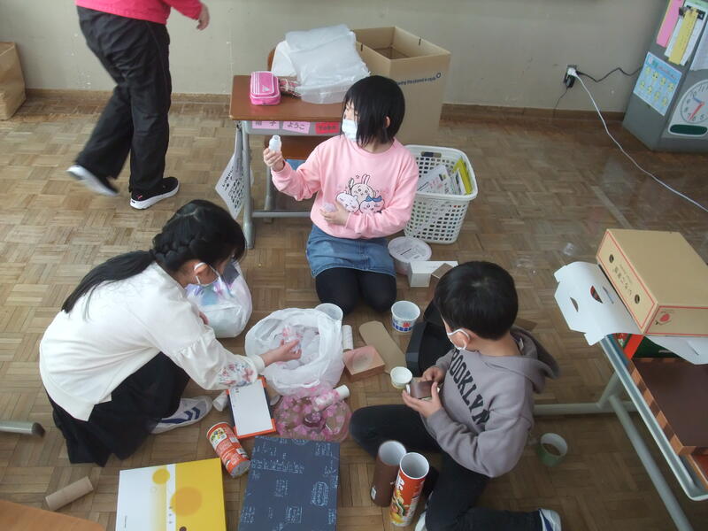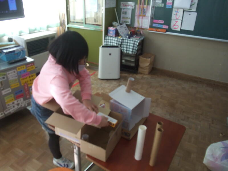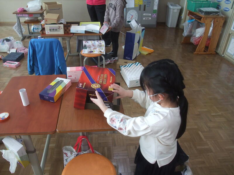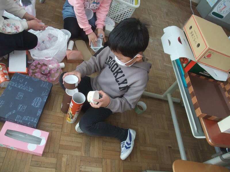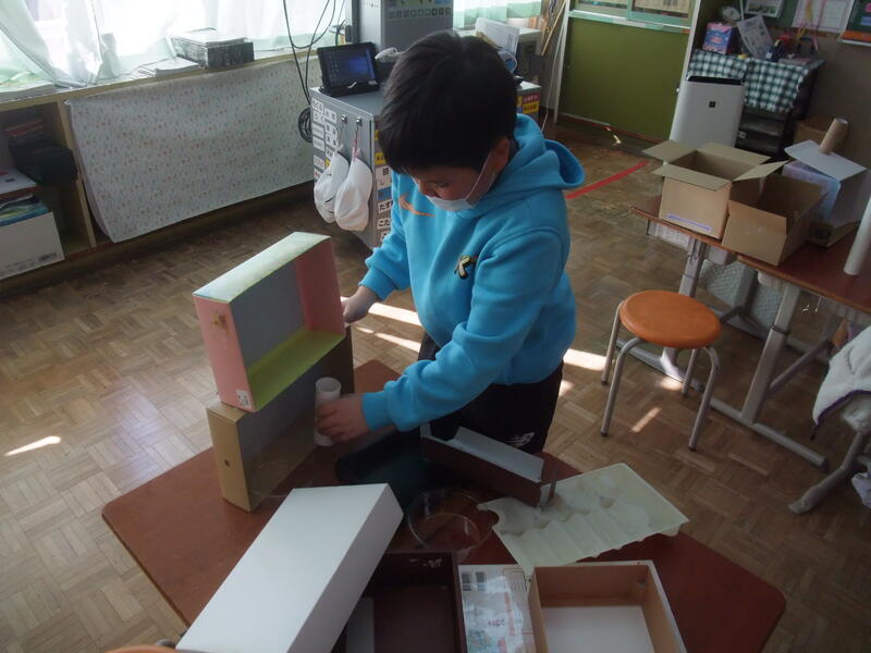 2年生の図画工作科です。題材は「ともだちハウス」です。箱などいろいろな材料を組み合わせて、こびとが喜ぶ家を作ろうというめあてです。みんな、想像力をふくらませて、材料をどのように組み合わせて作るか考えていました。
