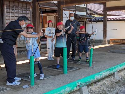 2024年7月5日 14時15分日新館では、見学だけでなく希望者が弓矢体験を行っています。遠く離れた的をめがけて弓を引きます。ぎゅうっと引き手を離すと、、スパンと的に飛んでいきます。見事に的に当てて、メダルをゲットした子もいました。中学年の活動ももう少しで終わりです。