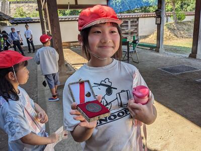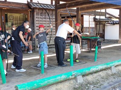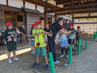 日新館では、見学だけでなく希望者が弓矢体験を行っています。遠く離れた的をめがけて弓を引きます。ぎゅうっと引き手を離すと、、スパンと的に飛んでいきます。見事に的に当てて、メダルをゲットした子もいました。中学年の活動ももう少しで終わりです。