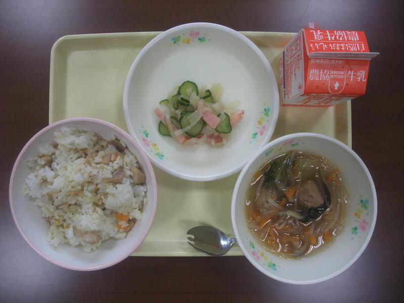 今日の献立は「大根サラダ、肉だんごスープ、チキンピラフ、牛乳」です。