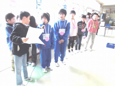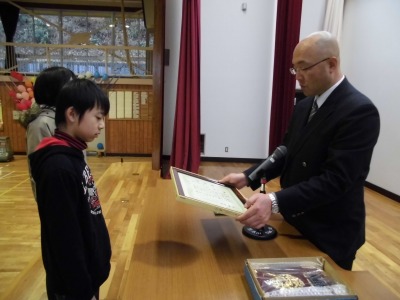まず、芳賀さんは、第1回いわせ地区小学校陸上競技交流大会のハードル走、や羽鳥湖マラソン大会の功績がたたえられての表彰です。二人目の根本さんは、第1回いわせ地区小学校陸上競技交流大会の走り高跳びの功績がたたえられての表彰となりました。