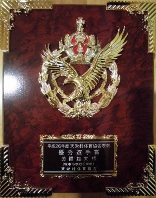 わかたけ集会で、天栄村体育協会より優秀選手賞をいただいた6年生2名の表彰を行いました。