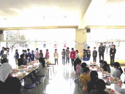 給食の前に、3月のお誕生会をしました。今月の誕生を迎えたのは、先生方を含め18人。牧本小学校の月別誕生者数で、最多の月です。
