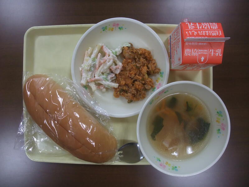 今日の献立は、「スラッピージョー、マカロニサラダ、コンソメスープ、背割れコッペパン、牛乳」です。スラッピージョーは、アメリカ生まれのミートソースをパンにはさんで食べる料理です。