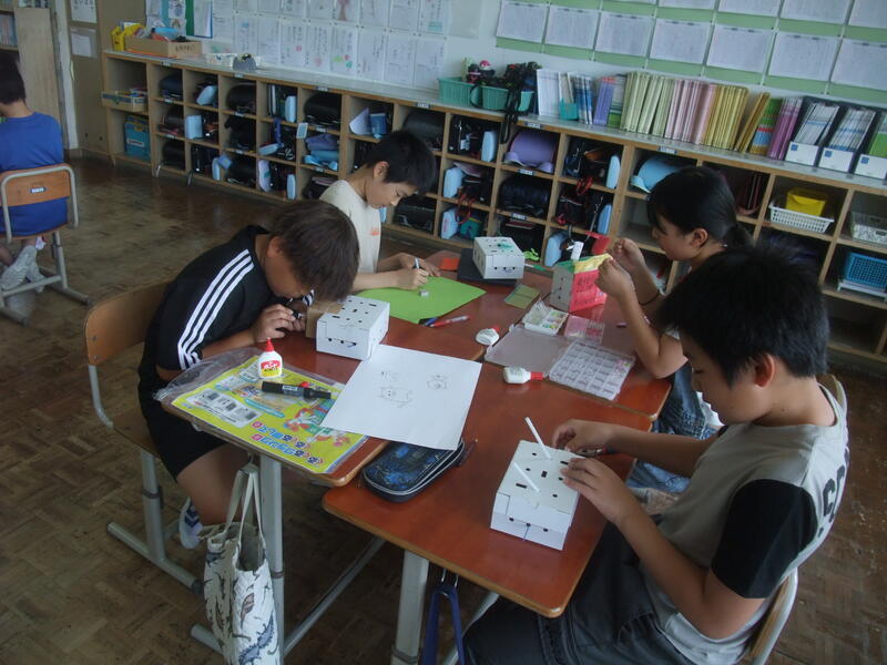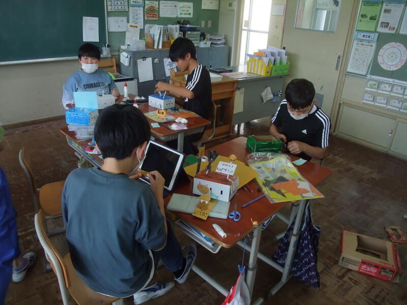 6年生の図画工作科です。工作「くるくるクランク」の続きです。だいぶ作業が進んで、完成した児童もいました。どの作品も工夫をこらした面白い作品になっています。