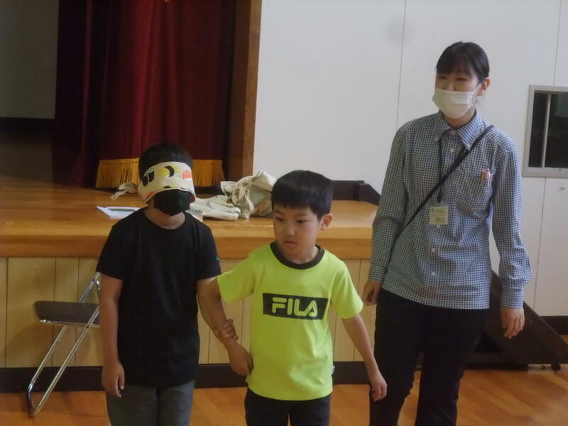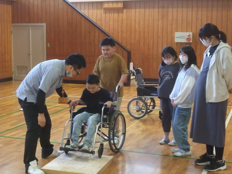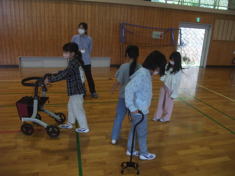 「福祉って、なんだろう?」「福祉のマークや標識を覚えよう」「福祉用具をさわってみよう」の3点について学習しました。地域包括支援センターの方に分りやすく説明していただきました。その後、車いすや歩行するための補助器具、目隠しして介助してもらいながら歩く体験などを行いました。初めて体験することも多く、とても勉強になりました。福祉について、一人一人が関心を深めることができました!天栄村地域包括支援センターの方々、ありがとうございました。