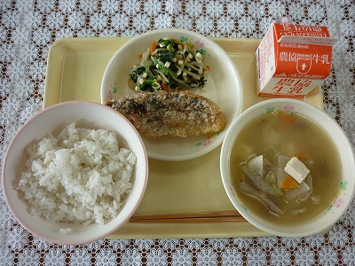 2025年12月11日 12時00分12月11日(木) 本日の給食は,天栄米ごはん,さけの利休揚げ,おひたし,沢煮わん,牛乳でした。