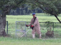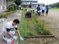 作業は、校庭の草むしりや校庭周辺の刈払い機による除草