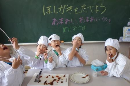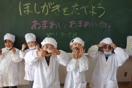 1年生が生活科の学習で取り組んできた「干し柿」が,ちょうど食べ頃に