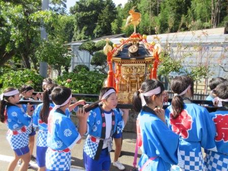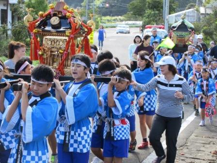 おみこし行列をして帰ってきました。全校生でワッショイ、ワッショイ