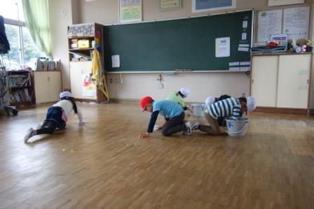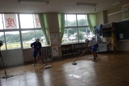 4日の5校時、全校生で愛校活動を行いました。今週床の水拭きを実施