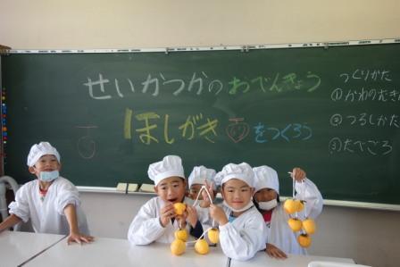 1年生が生活科の学習で、「ほし柿づくり」に取り組みました。