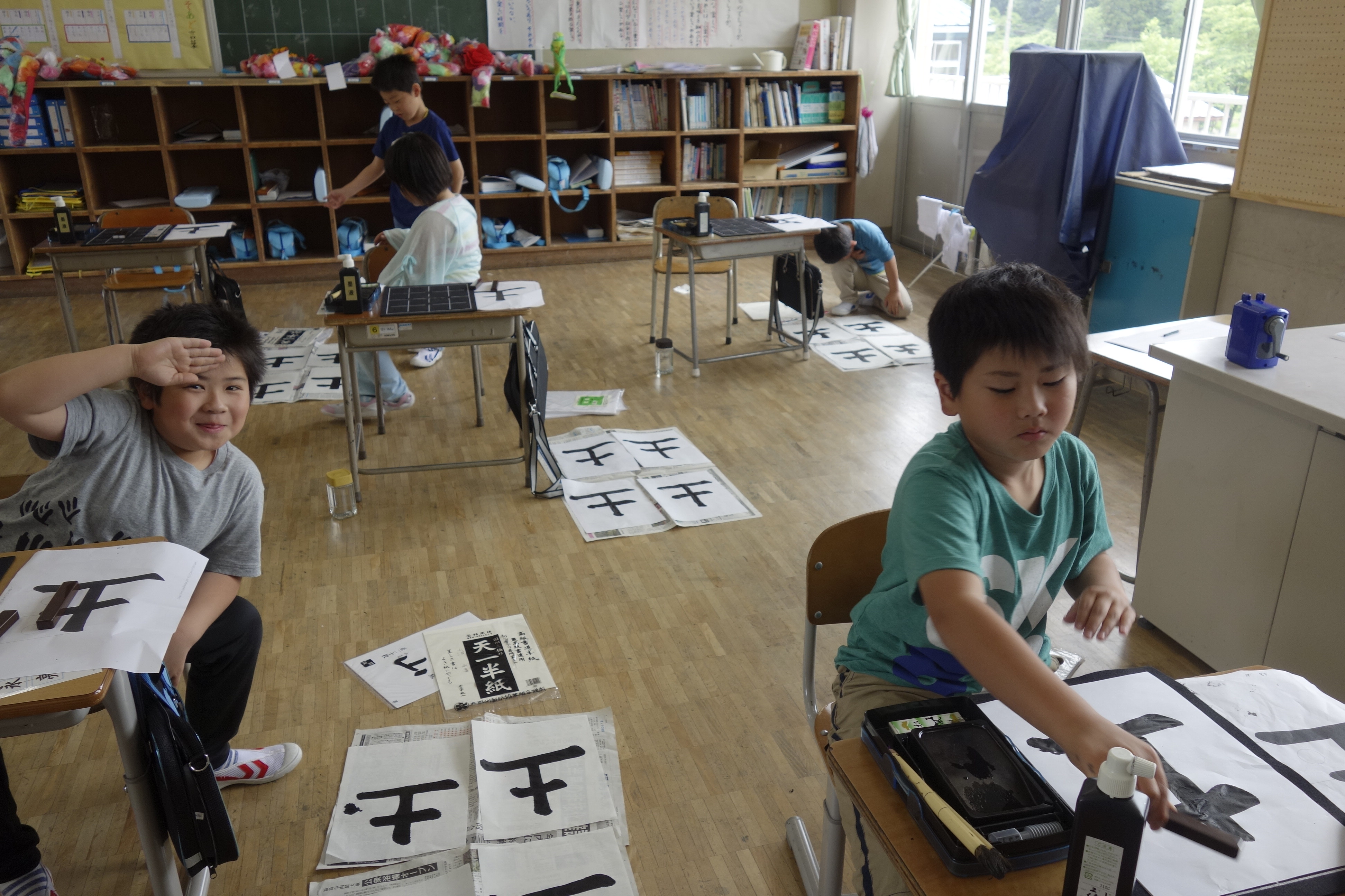 3年生が書写で、毛筆の学習を始めています。筆を使って