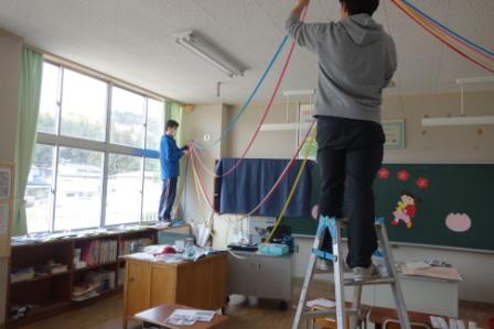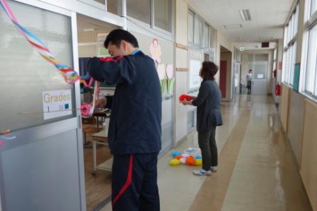 さて、本日の午前中は入学式の会場作成や1年生教室の飾り付けを職員