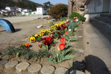 ます。パンジーやすいせんにまじって、チューリップの花も咲き始め