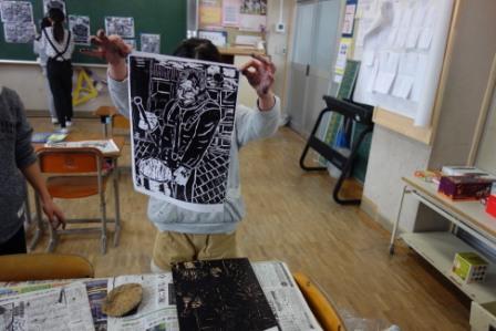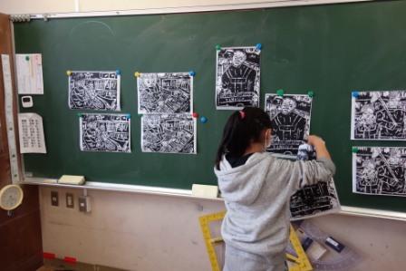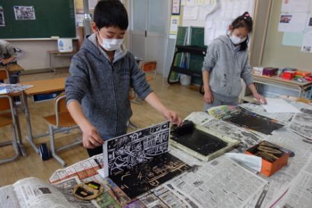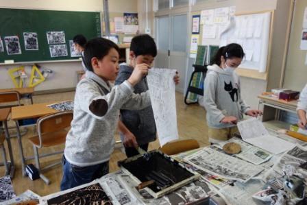 4年生が図工の学習で取り組んできた木版画、いよいよ刷りの作業を
