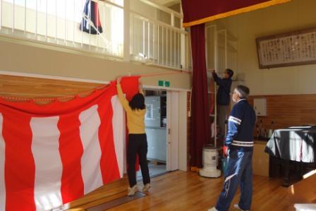 づくりをしました。紅白幕や装飾、椅子や机の準備をして清掃を行いました。