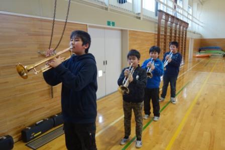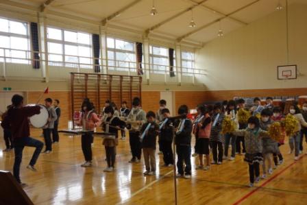 式の様子です。在校生が、鼓笛の曲を教えてくださった6年生の前で堂々と演奏を