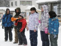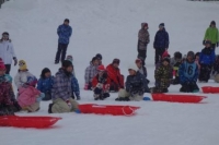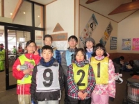 25日の湯本小の交流学習、午後はゲレンデでそり滑りリレーとミカン探しのレクを行い