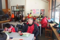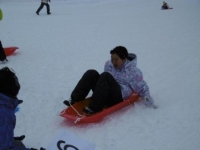 グループでスキー教室、午後はそり滑りリレーやミカン探しなどのレクを行いました。