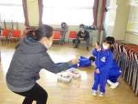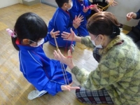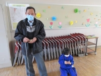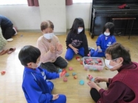 だんごさしでお世話になったあとは、音楽室でお年寄りの人たちに昔遊びを教えて