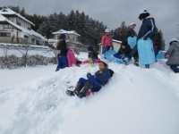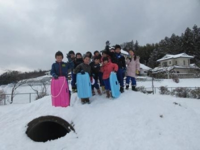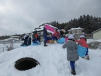 大雪に見舞われた昨日、校庭の大雪を見て1,2年生がさっそく、かまくら作りとそり遊び