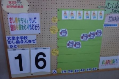 保健室前のむし歯治りょうについての掲示の様子です。むし歯治療が必要なお子