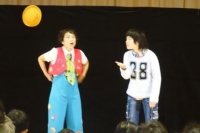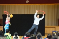 を大里小の体育館で子どもたちに披露してくださったのは「チカパンさん」、パンとマイム