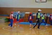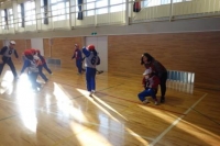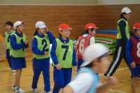 7日の湯本小交流、3・4年生は湯本小の4年生と一緒に体育の授業で「新聞紙サッカー」