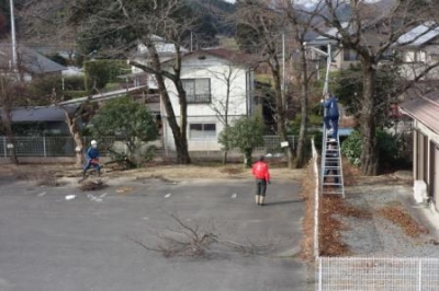 の板橋さんが俊敏な動きで木登りをし、伐採してくれました。作業を見守って校長先生 もハラハラ、でも無事作業が終了してすっきりしました。きりとった後の枝の処理は、